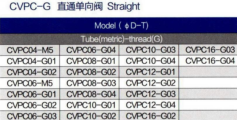 CVPC04-M5,CVPC06-G01,CVPC08-G02,CVPC10-G01,CVPC12-G03,CVPC12-G04,直通單向閥