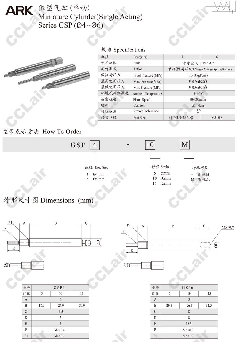 詳細信息 GSP4-5,GSP4-10,GSP4-15,GSP6-5,GSP6-10,GSP6-15,ARK微型氣缸
