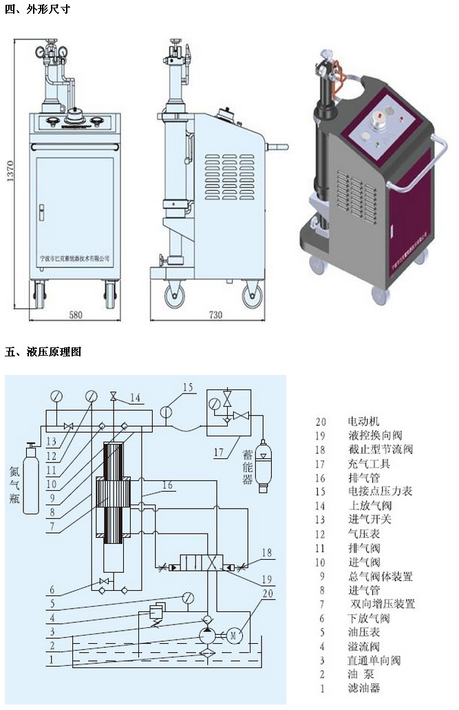 本型充氮車(chē)由液壓裝置、氣路裝置和電氣裝置等組成,當壓力流體通過(guò)換向閥進(jìn)入增壓器時(shí),推動(dòng)活塞作向上(下)運動(dòng),使進(jìn)入到上(下)增壓器的氮氣增壓,且經(jīng)單向閥充入蓄能器(或高壓容器)內,活塞如此上下往復運動(dòng),使氮氣增壓到所需要的工作壓力。