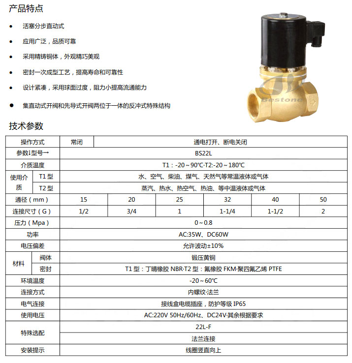 詳細信息 BS22L-DN15,BS22L-DN20,BS22L-DN25,BS22L-DN32,BS22L-DN40,BS22L-DN50,活塞分步直動(dòng)式黃銅電磁閥