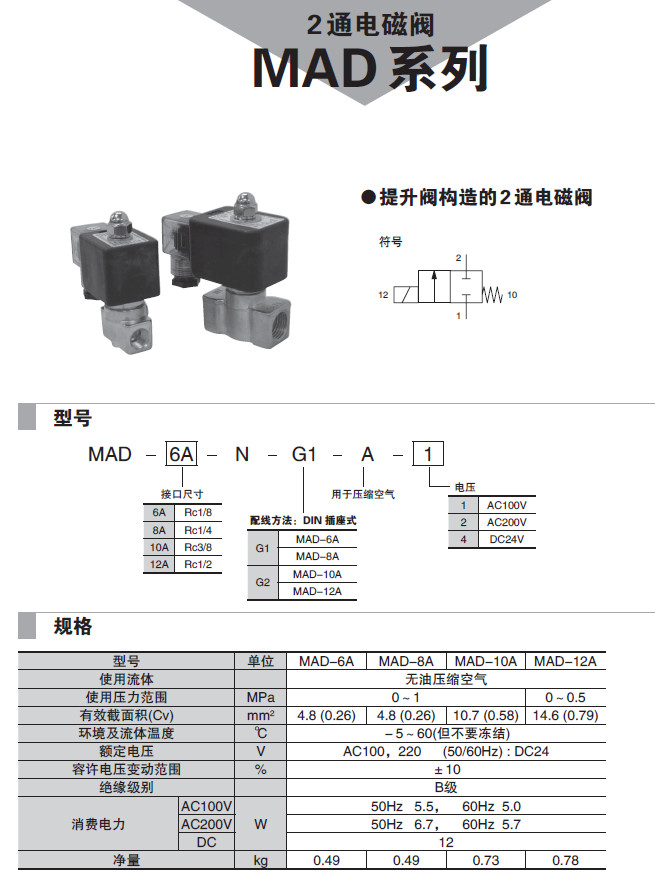 詳細信息 MAD-6A-N-G1-A-1,MAD-8A-N-G1-A-1,MAD-10A-N-G2-A-1,MAD-12A-N-G2-A-1,2通電磁閥