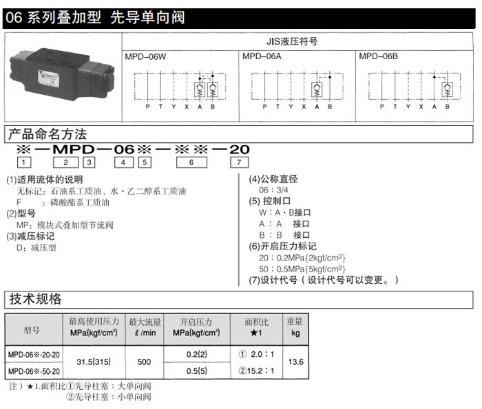 MPD-06W-20-20,MPD-06A-20-20,MPD-06B-20-20,MPD-06W-50-20,MPD-06A-50-20,MPD-06B-50-20,DAIKIN疊加型先導單向閥