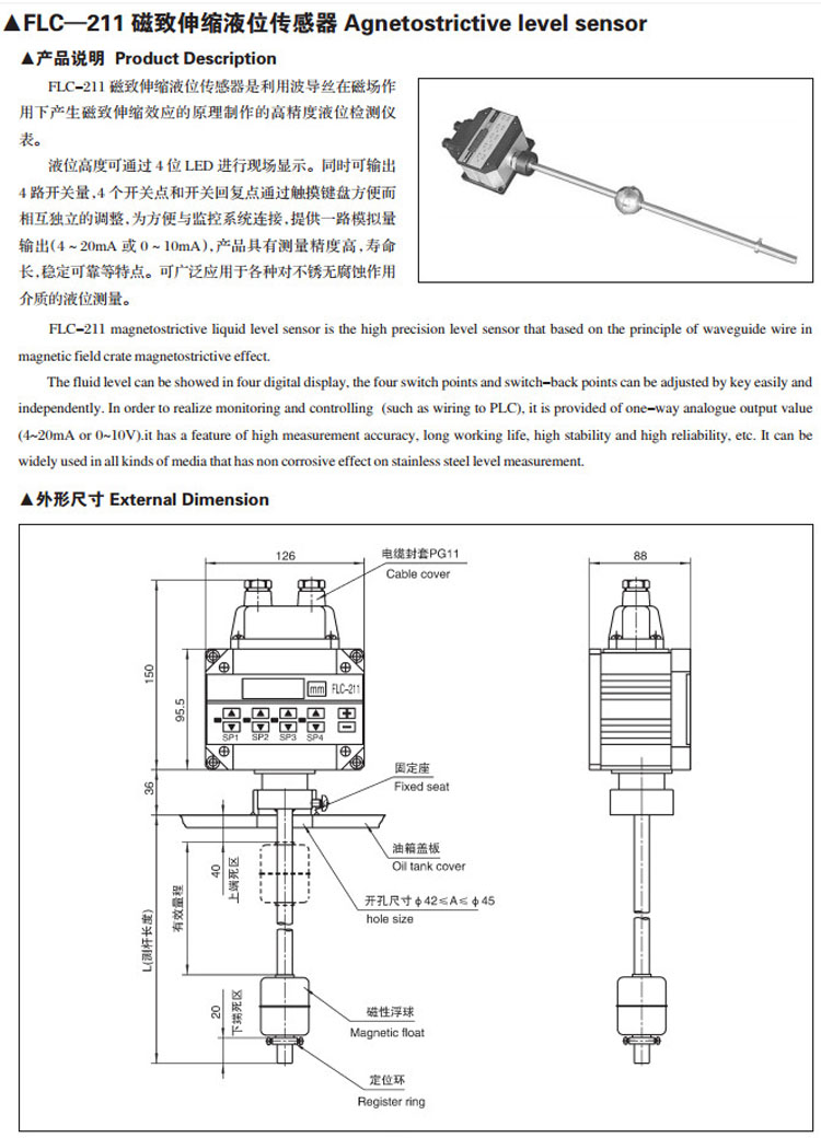 詳細信息 FLC-211,磁致伸縮液位傳感器