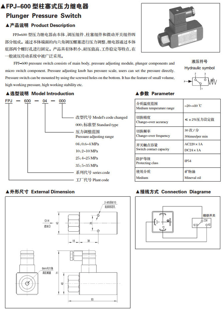 詳細信息 FPJ-600-04,FPJ-600-10,FPJ-600-25,FPJ-600-35,柱塞式壓力繼電器