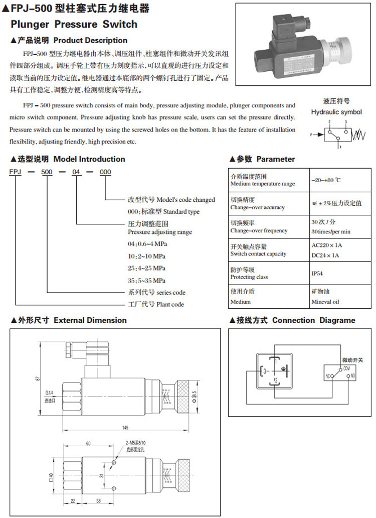 詳細信息 FPJ-500-04,FPJ-500-10,FPJ-500-25,FPJ-500-35,柱塞式壓力繼電器