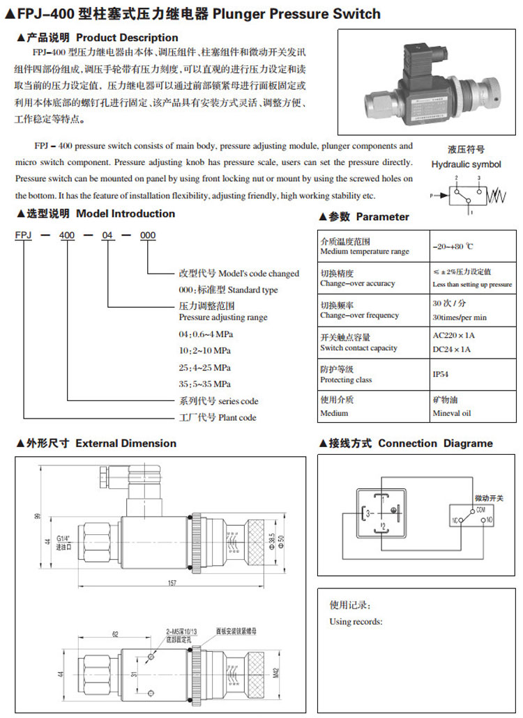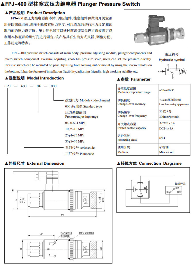 詳細信息 FPJ-400-04,FPJ-400-10,FPJ-400-25,FPJ-400-35,柱塞式壓力繼電器