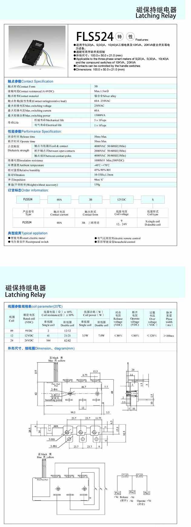 詳細信息 FLS524-60A,磁保持繼電器