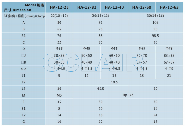 HA-12-25,HA-12-32,HA-12-40,HA-12-50,HA-12-63,下法蘭空壓轉角缸