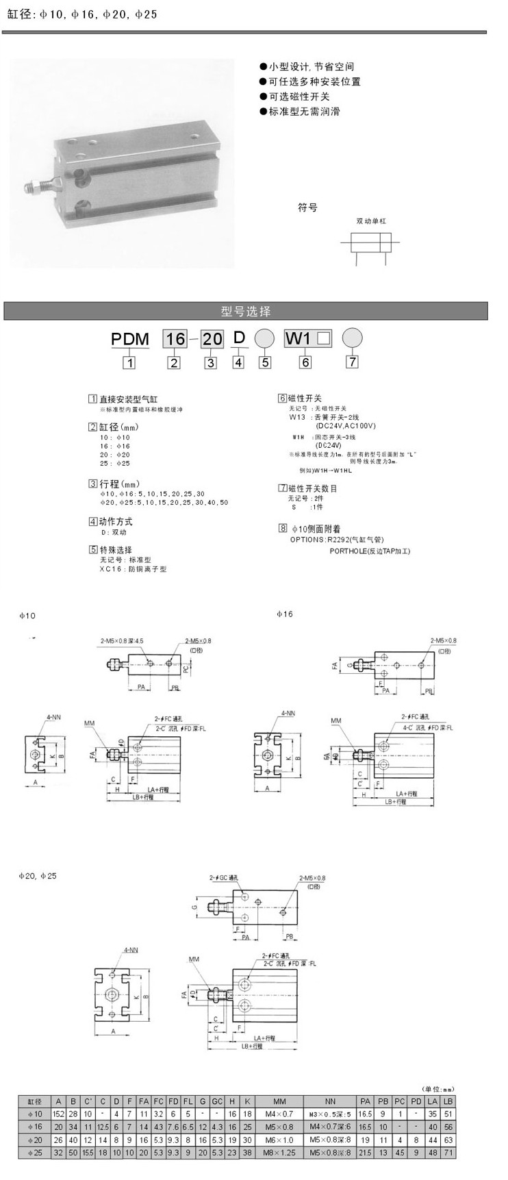 PDM10-5D,PDM10-10D,PDM10-15D,PDM10-20D,PDM10-25D,PDM10-30D,直接安裝型氣缸PDM系列