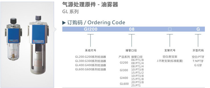 GL200-06,GL200-08,GL300-08,GL300-10,GL300-15,GL400-10,GL400-15,GL600-20,GL600-25,氣源處理原件--油霧器