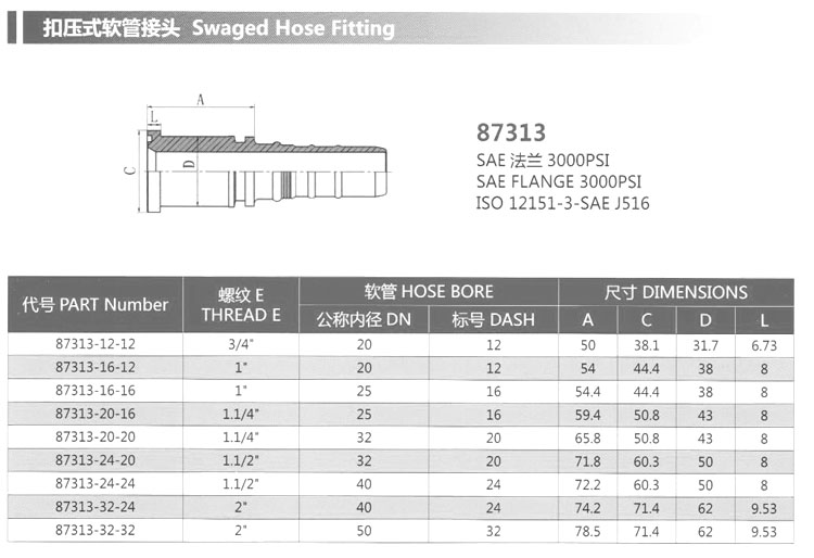 87313-12-12,87313-16-12,87313-20-16,87313-24-24,87313-32-32,扣壓式軟管接頭