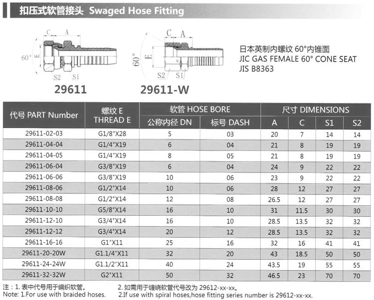 29611-02-03,29611-04-04,29611-08-06,29611-16-16,29611-24-24W,29611-32-32W,扣壓式軟管接頭