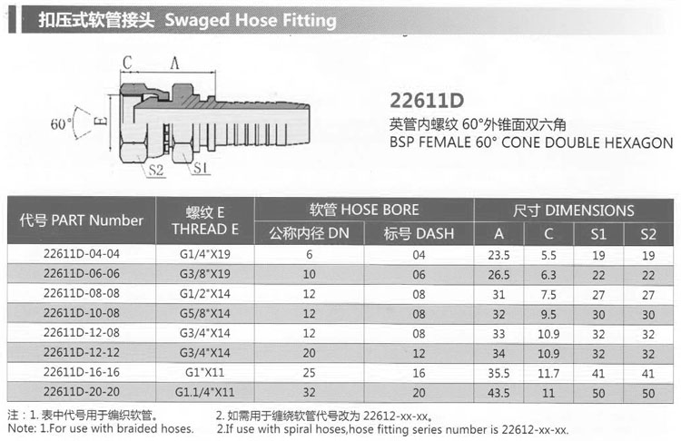 22611D-04-04SM,22611D-06-06SM,22611D-08-08SM,22611D-10-08SM,22611D-20-20SM,扣壓式軟管接頭