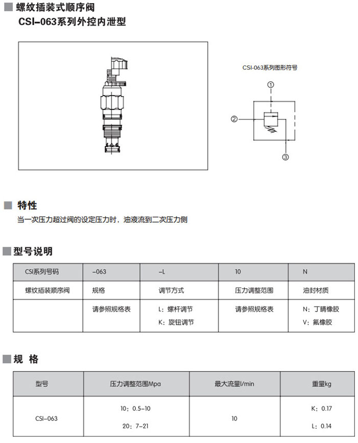 CSI-063-L10N,CSI-063-L20N,CSI-063-K10N,CSI-063-K20N,CSI-063-L10V,CSI-063-L20V,螺紋插裝式順序閥 詳細信息 CSI-063-L10N,CSI-063-L20N,CSI-063-K10N,CSI-063-K20N,CSI-063-L10V,CSI-063-L20V,螺紋插裝式順序閥