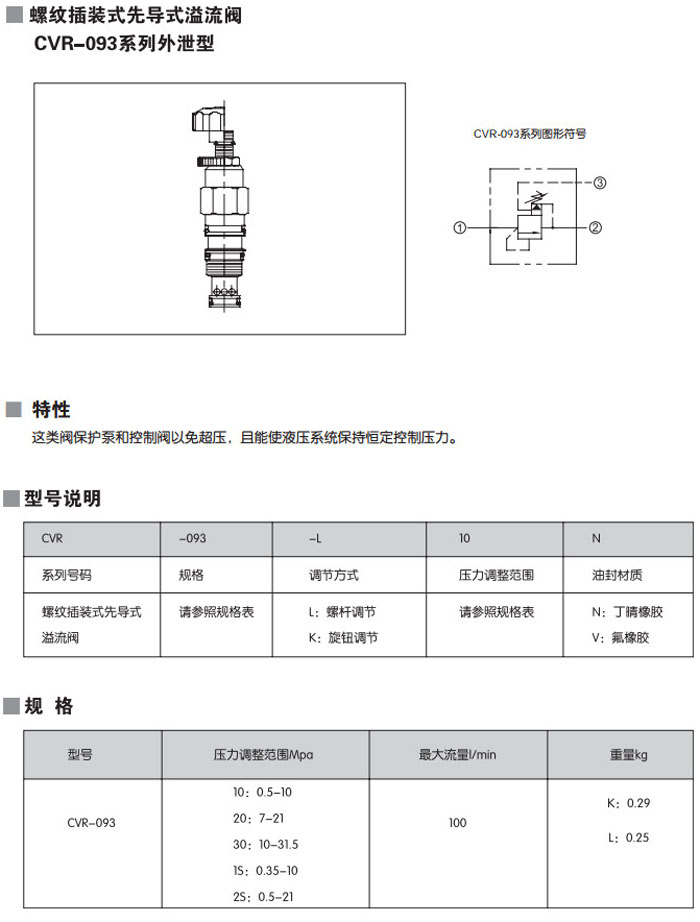 CVR-093-L10N,CVR-093-K10N,CVR-093-L20N,CVR-093-L30N,CVR-093-L1SN,CVR-093-L2SN,螺紋插裝式先導式溢流閥