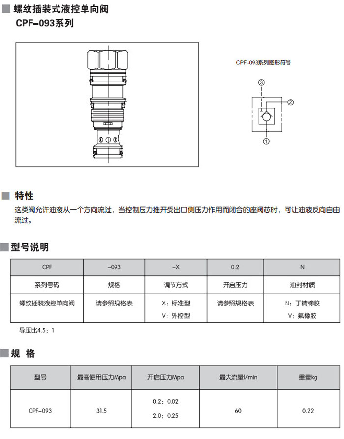 CPF-093-X0.2N,CPF-093-X2.0N,CPF-093-V0.2N,CPF-093-V2.0N,CPF-093-X0.2V,螺紋插裝式液控單向閥
