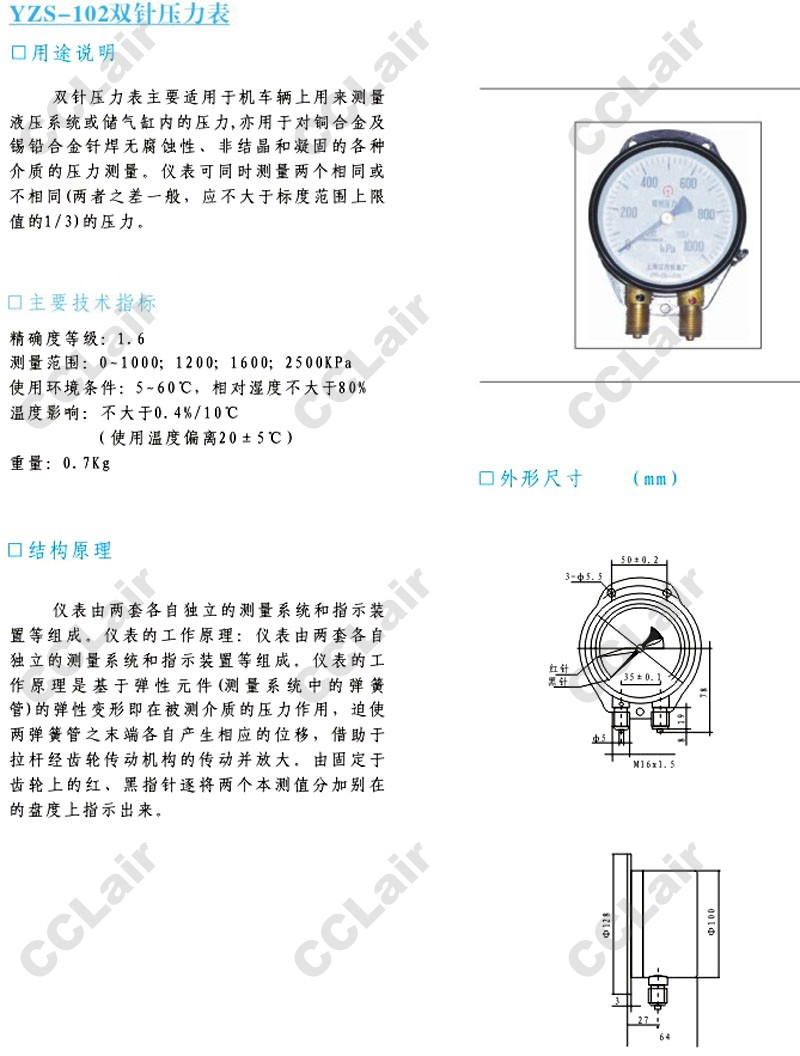 詳細信息 YZS-102,雙針壓力表,CCLair