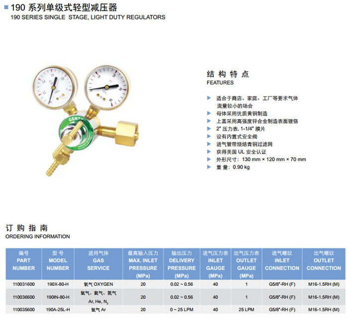 190X-80-H,190IN-80-H,190A-25L-H,單級式輕型減壓器 詳細信息 190X-80-H,190IN-80-H,190A-25L-H,單級式輕型減壓器