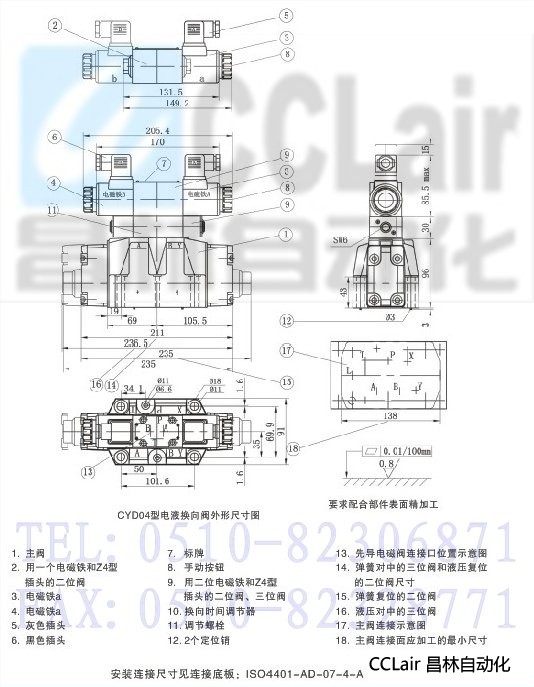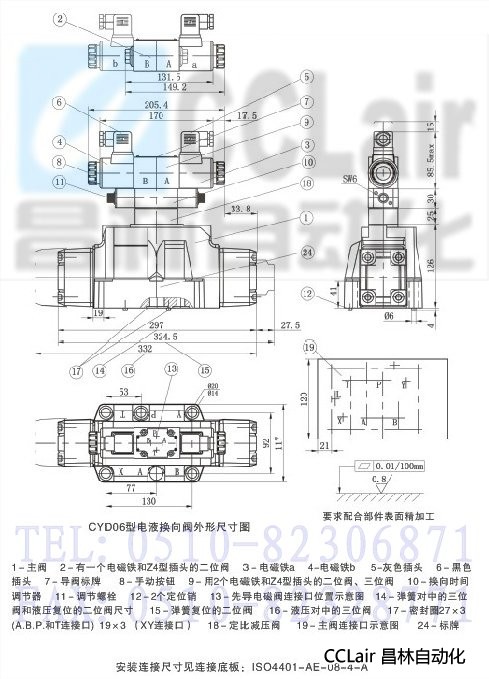 CYD系列電液換向閥有10通徑、16通徑、25通徑和32通徑尺寸規格,安裝底板符合ISO4401標準。