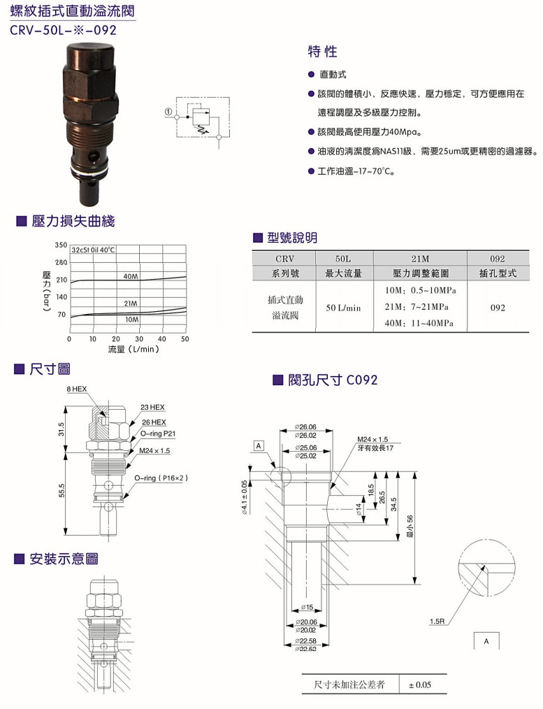CRV-50L-10M-092,CRV-50L-21M-092,CRV-50L-40M-092,螺紋插式直動(dòng)溢流閥