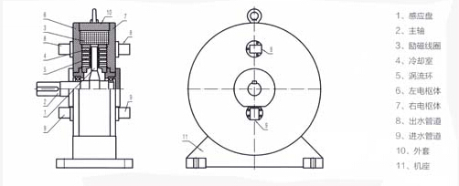 當激磁線(xiàn)圈通上直流電時(shí),其產(chǎn)生的磁通經(jīng)左右電樞體、渦流環(huán)、感應盤(pán),形成閉合磁路,有與轉子形狀猶如直齒輪,當感應盤(pán)被原動(dòng)機帶動(dòng)旋轉時(shí),渦流環(huán)內表面產(chǎn)生疏密相間的磁場(chǎng),該磁場(chǎng)在渦流環(huán)的表面上任一點(diǎn)呈交變變化,因此在渦流環(huán)內表面及一定深度范圍內產(chǎn)生渦流,由于渦流形成的磁場(chǎng)與原磁場(chǎng)的相互作用,在感應盤(pán)上就產(chǎn)生了制動(dòng)力矩。