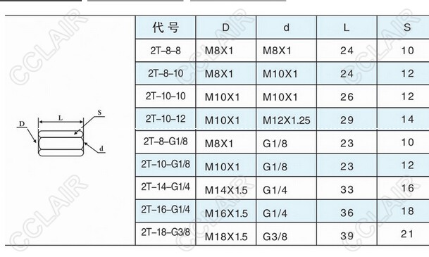 2T-8-8,2T-8-10,2T-10-10,2T-10-12,2T-8-G1/8,2T-10-G1/8,2T-18-G3/8,內接雙通接頭