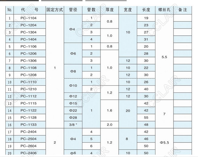 詳細信息 PC-1104,PC-1204,PC-1304,PC-1404,PC-1106,PC-1206,PC-1306,PC-1108,PC-2406,管夾
