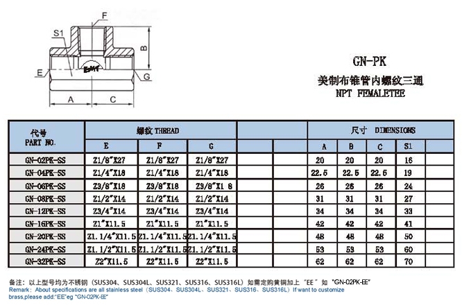 GN-02PK-SS,GN-04PK-SS,GN-12PK-SS,GN-24PK-SS,GN-32PK-SS,三通內絲接頭
