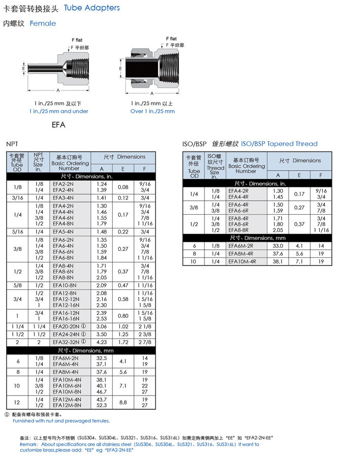 EFA2-2N,EFA3,EFA4,EFA6,EFA8,EFA10,EFA12,EFA16,EFA20,EFA24,EFA32,直通內絲卡套接頭