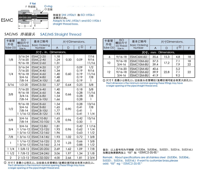 ESMC2-2U,ESMC4-2U,ESMC5-5U,ESMC6-4U,ESMC8-6U,ESMC10-8U,ESMC20-20U,直通終端卡套接頭