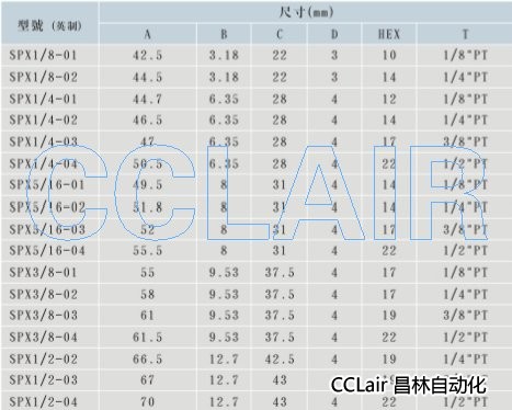 詳細信息 SPX1/8-01,SPX1/8-02,SPX1/4-02,SPX5/16-01,SPX3/8-01,SPX3/8-03,SPX1/2-04,接頭