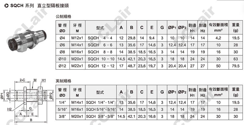 氣立可(chelic),SQCH4-4,SQCH10-10,SQCH12-12,SQCH6-6,SQCH8-8,SQCH3/8-3/8,SQCH1/4,SQCH5/16,直立型隔板接頭