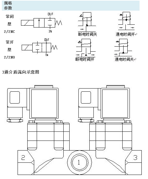 2:當電磁閥線(xiàn)圈斷電時(shí),1與2關(guān)閉,1通向3。