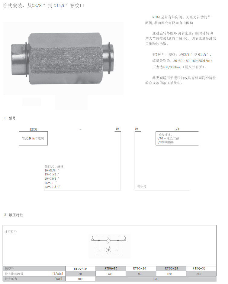 詳細信息 RTDQ-10-10,RTDQ-15-10,RTDQ-20-10,RTDQ-25-10,RTDQ-32-10,單向節流閥