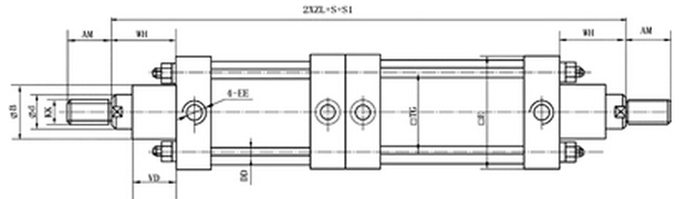 缸徑80mm,行程S為200mm,S1為300mm腳架式的雙活塞氣缸QGBII-H80*200*300-MS1.