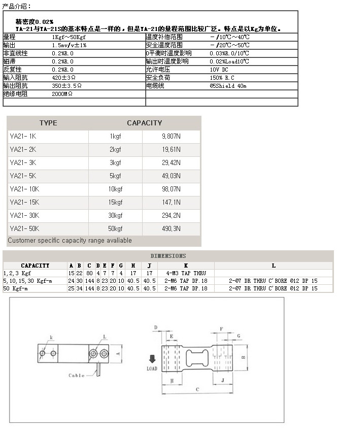 詳細信息 YA21-1K,YA21-2K,YA21-3K,YA21-5K,YA21-10K,YA21-15K,setech稱(chēng)重傳感器