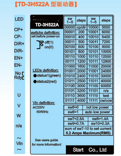 TD-3H522A型步進(jìn)驅動(dòng)器,主要用于驅動(dòng)110型三相混合式電機。其運行步數(細分數)達到28種,最大步數6萬(wàn),通過(guò)撥位開(kāi)關(guān)的第1-5位來(lái)設定步數.具有單雙脈沖方式,自測試功能,相位記憶功能,自動(dòng)半電流功能。本驅動(dòng)器可以輸出的最大電流為5.2A(有效值),可以很方便的通過(guò)撥位開(kāi)關(guān)的第7-10位來(lái)設定你需要的輸出電流(可以設定16檔電流,設定分辨率0.3A).本驅動(dòng)器一般采用交流供電,Vin電壓下限值AC180V上、限值AC240V、典型值AC200V和AC220V,其供電功率不小于600W.