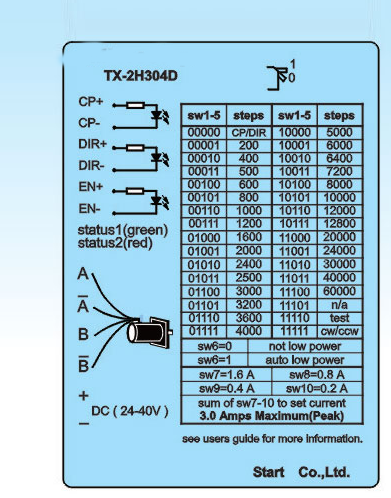 TX-2H304D 兩相混合式步進(jìn)驅動(dòng)器,主要用于驅動(dòng)57型、相電流為3A及以下的二相混合式電機.其運行步數(細分數)達到28類(lèi),最大步數6萬(wàn),通過(guò)撥位開(kāi)關(guān)的第1-5位來(lái)設定步數。具有單雙脈沖方式,自測試功能,相位記憶功能,自動(dòng)半電流功能.本驅動(dòng)器可以輸出的最大電流為3.0A(峰值),可以很方便的通過(guò)撥位開(kāi)關(guān)的第7-10位來(lái)設定你需要的輸出電流(可以設定16檔電流,設定分辨率0.2A)。本驅動(dòng)器為直流供電,下限值DC24V,上限值DC40V,典型值DC24V或32V,建議使用開(kāi)關(guān)電源供電,其供電功率不小于60W.