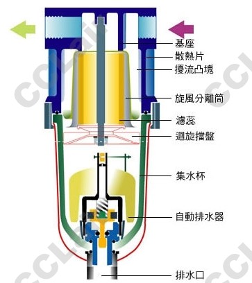 為使壓縮空氣有效去除水份及不阻塞濾蕊,以創(chuàng )新的設計結構,將擾流分離等物理原理多重應用在濾蕊之前端,可去除大部份的水份與雜質(zhì),剩餘的水份再由過(guò)濾蕊子來(lái)濾除,如此配置將可有效去除水份與雜質(zhì),其濾蕊不易阻塞,可延長(cháng)使用壽命,更不會(huì )產(chǎn)生壓降,使空壓系統操作順暢無(wú)後顧之憂(yōu)。