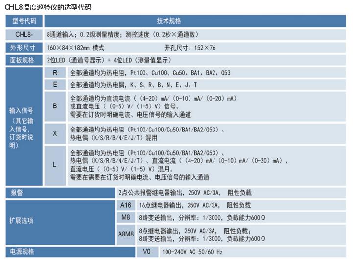 CHL8溫度巡檢儀的基本性能 ■0.2級精度,測控速度每通道0.2秒 ■8通道輸入,可輸入熱電阻,熱電偶,直流電流,直流電壓信號。 ■可選配8路變送輸出,實(shí)現8個(gè)輸入信號的變送輸出。 ■可選配8點(diǎn)報警輸出或16點(diǎn)(無(wú)變送輸出時(shí))報警輸出,實(shí)現每通道1點(diǎn)或2點(diǎn)報警輸出。