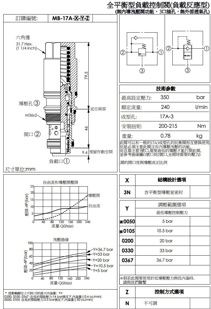 MB-17A-3N-0050-N,MB-17A-3N-0105-N,MB-17A-3N-0140-N,MB-17A-3N-0200-N,winner全平衡型負載控制閥