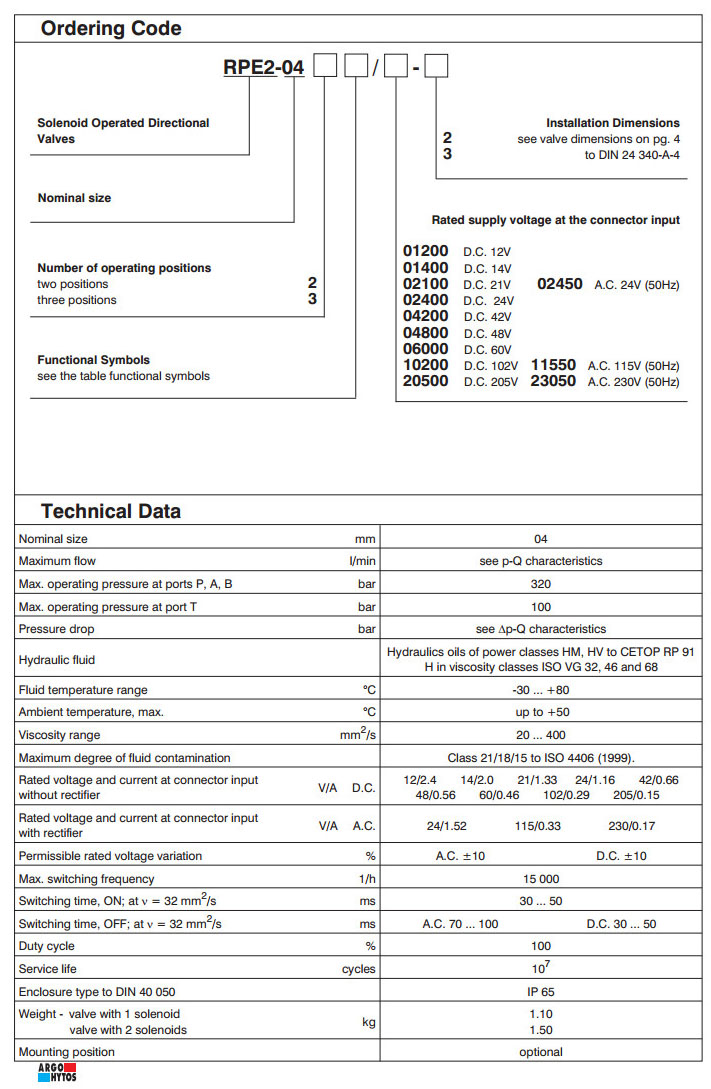 詳細信息 RPE2-042,RPE2-043,RPE2-042C11/01200,RPE2-043P51/01400,RPE2-042Z51/01400,ARGO電磁方向控制閥