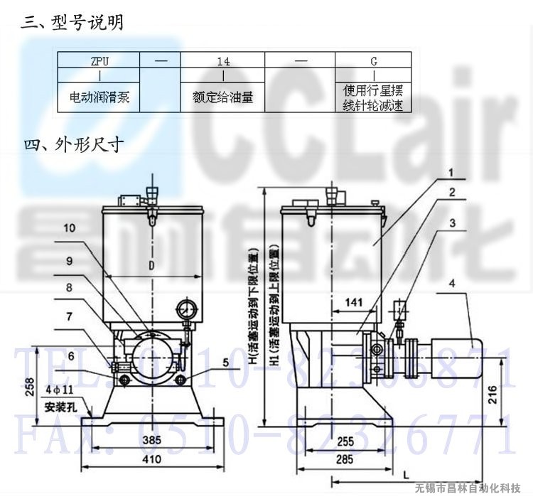 | 1、貯油筒;2、泵座;3、帶連結法蘭的柱塞泵裝置;4、減速電機5、加油口G3/4; 6、回油口G3/4;7、調壓安全閥;8、出油口G3/4;9、過(guò)濾器;10、單向閥 |