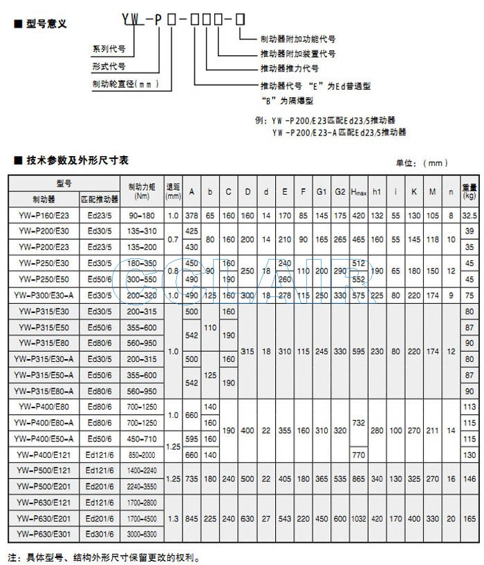 詳細信息 YW-P315/E80,YW-P315/E30-A,YW-P315/E50-A,YW-P315/E80-A,電力液壓鼓式制動(dòng)器