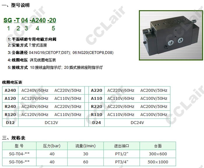 詳細信息 SG-T04-A240-20,SG-T06-A120-20,SG-T04-R120-20,SG-T04-D12-20,SG-T06-D24-20,電磁方向閥