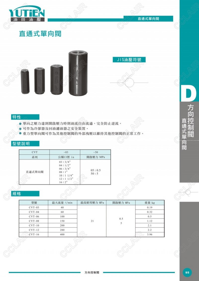 YUTIEN油田 直通式單向閥CVT-03-05,CVT-03-50,CVT-04-05,CVT-04-50,CVT-06-05,CVT-06-50,CVT-08-05,CVT-08-50,CVT-10-05 CVT-10-50,CVT-12-05,CVT-12-50,CVT-16-05,CVT-16-50