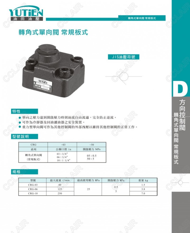 YUTIEN油田 轉角式單向閥CRG-03-05,CRG-03-50,CRG-06-05,CRG-06-50,CRG-10-05,CRG-10-50