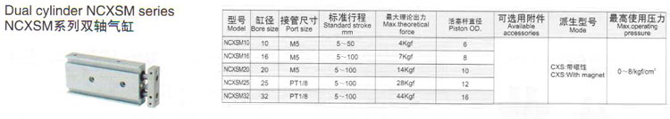 NCXSM10,NCXSM16,NCXSM20,NCXSM25,NCXSM32,雙軸氣缸