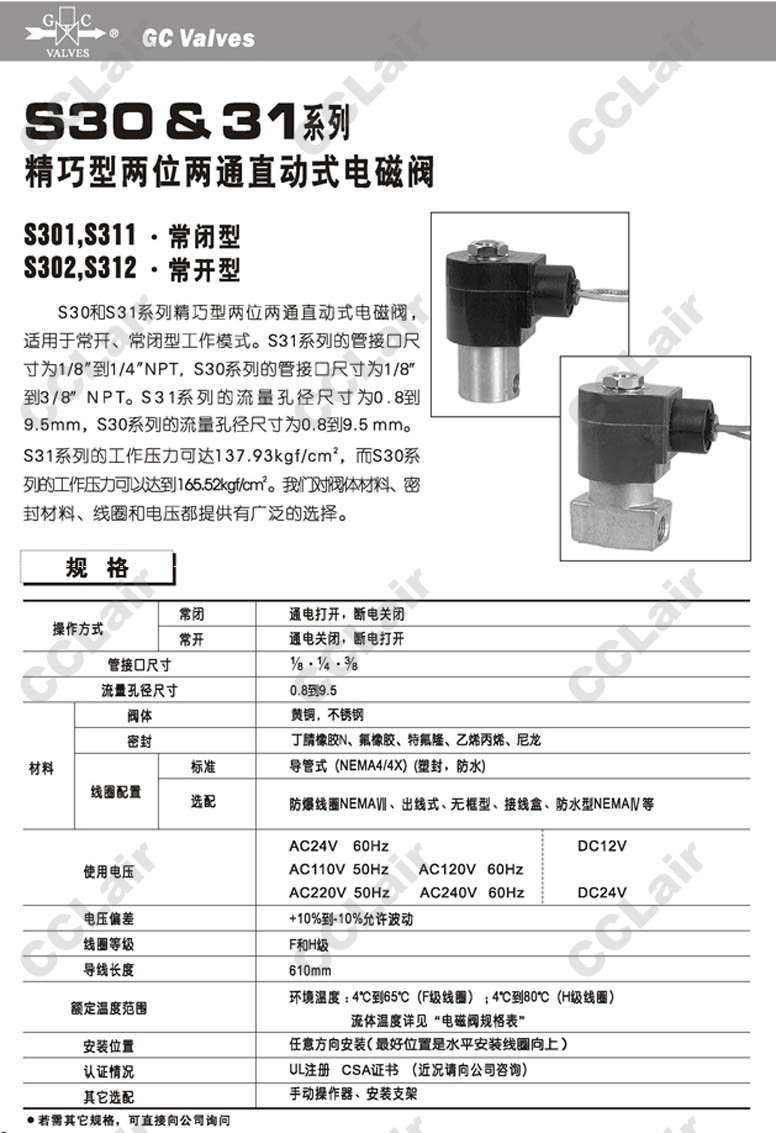 S311GF02C,S311GF02N,S311GF02V,S311GF02R,S311GF02T,S312GF02T8AE1,GC Valves二位二通小型直動(dòng)式電磁閥