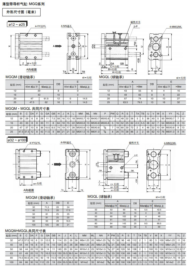 MGQL12,MGQL16,MGQL20,MGQL25,MGQL32,MGQL40,MGQL50,MGQL63,MGQL80,MGQL100,MGQL12-10,SMC薄型帶導桿氣缸